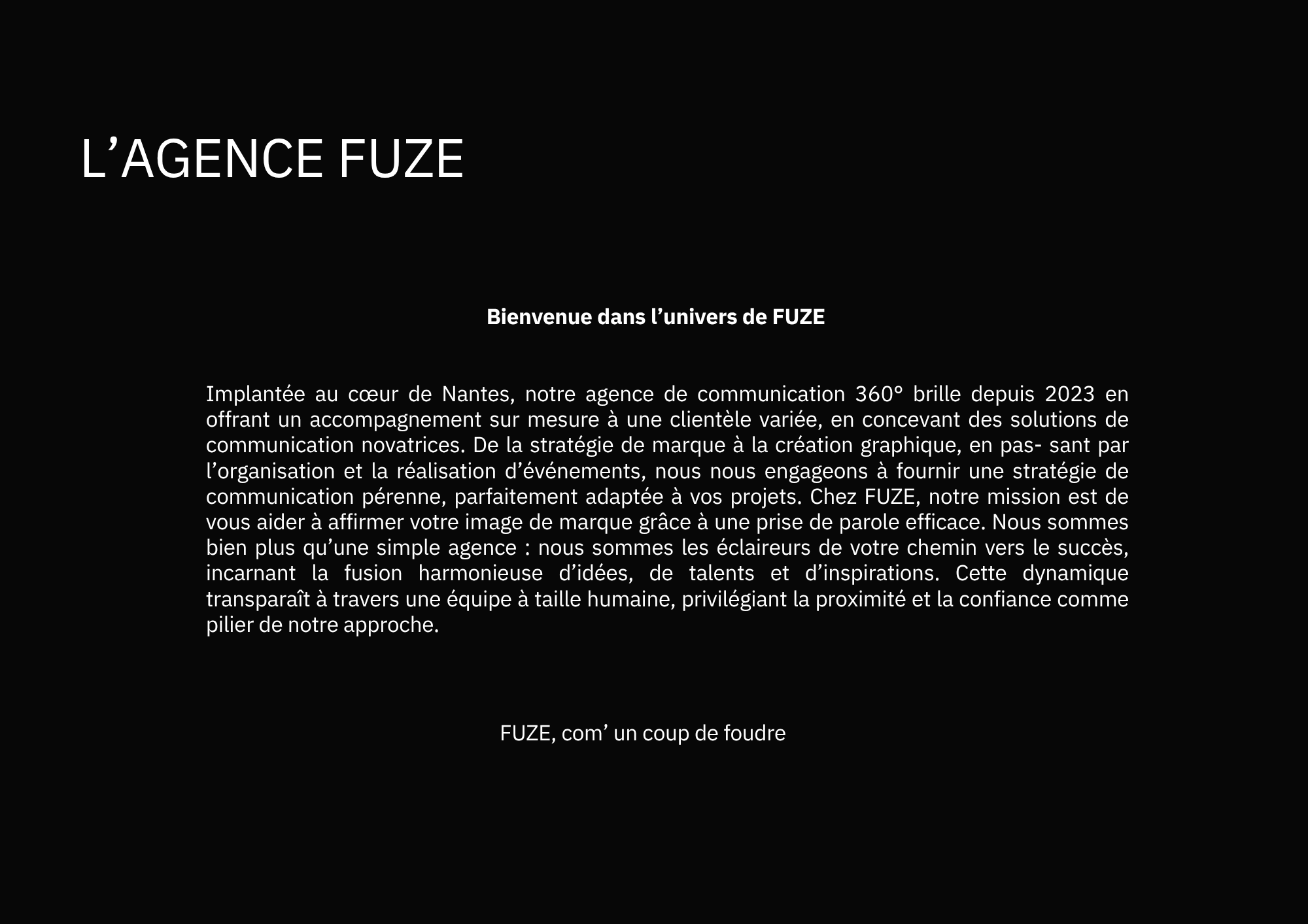 Fuze est une agence de communication fictive imaginée dans le cadre d’un projet scolaire, avec pour objectif de proposer des stratégies de communication innovantes et adaptées à de véritables entreprises confrontées à des besoins spécifiques.