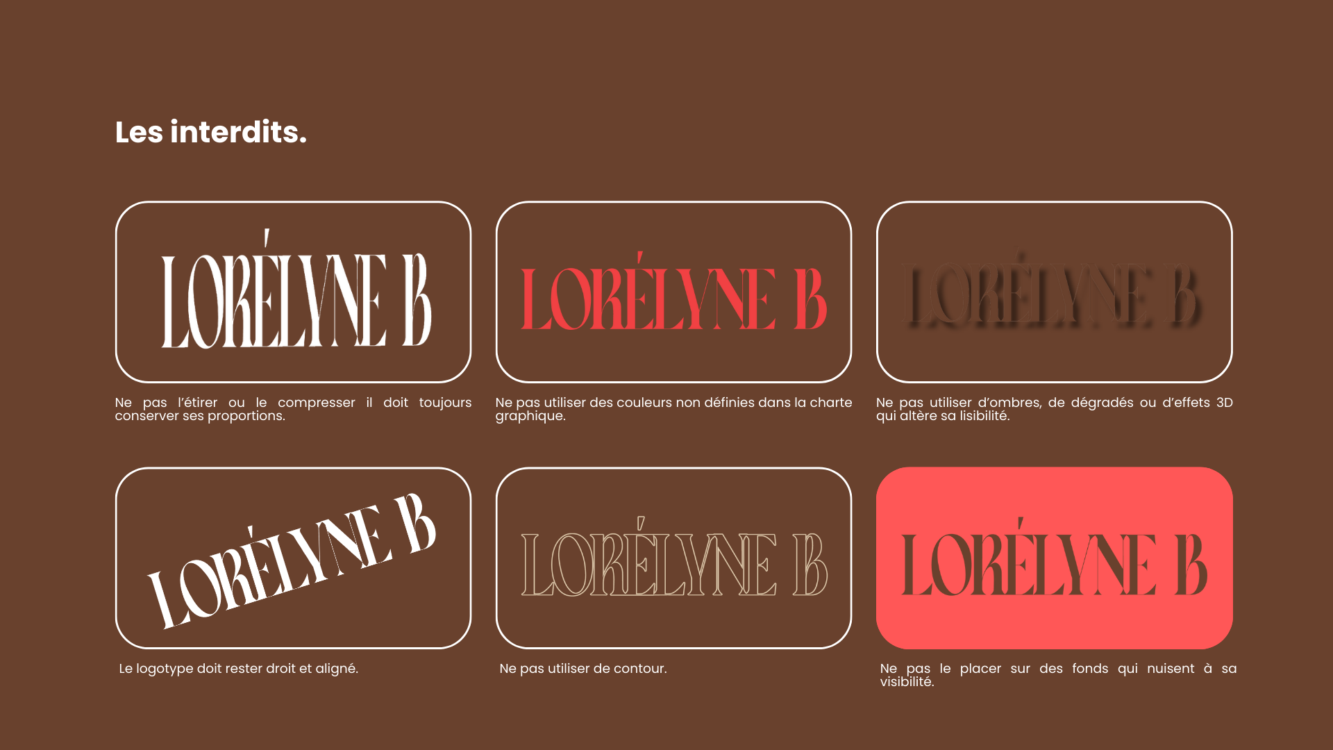 Ce projet visait à concevoir une identité visuelle complète, capable de refléter l’univers sobre et élégant de Lorélyne B. La charte graphique a été pensée comme un véritable outil de cohérence et de valorisation de la marque. Elle s’articule autour de logos épurés et équilibrés, d’une palette de couleurs harmonieuse et de typographies simples et modernes. L’ensemble crée une identité lisible, raffinée et parfaitement adaptée aux différents usages, du salon privé aux réseaux sociaux.